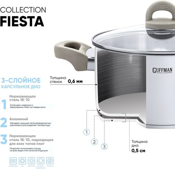 | Совместимость с конфорками | газ, электро, стеклокерамика, индукция |