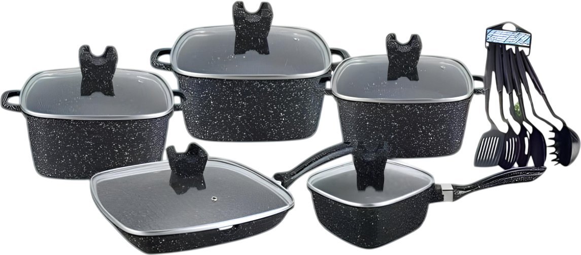 | Состав набора | кастрюля (3 шт.), крышка (5 шт.), сковорода, ковш, кухонные принадлежности |
