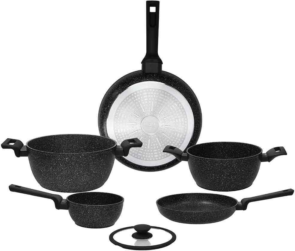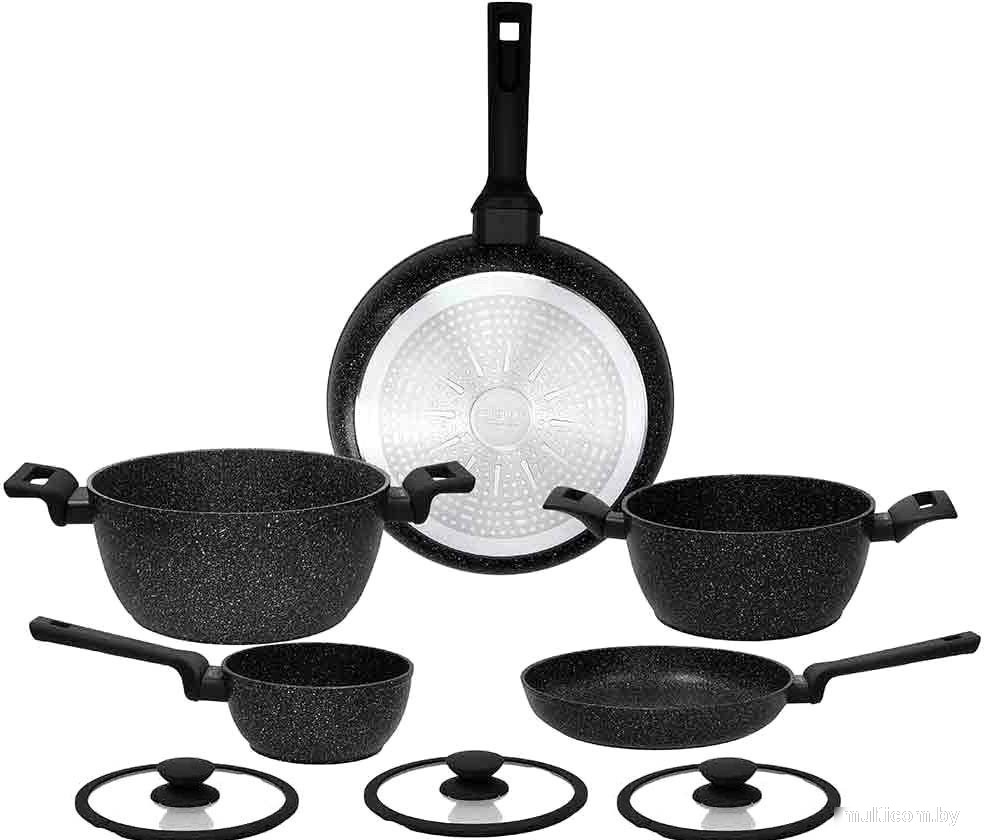| Состав набора | сковорода (2 шт), кастрюля (2 шт), ковш, крышка (3 шт) |