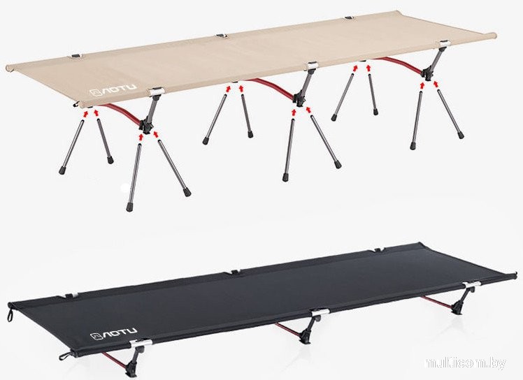 | Информация | - Название: Раскладушка туристическая (кушетка) - Бренд: AOTU - Модель: AT6758 - Материалы: - тент: Оксфорд (Oxford) 600D, 100% полиэстер - каркас: Алюминий марки 7075 - пластик марки Polyamide 66 (PA66) - Размеры: 190х65х39 см - Рекомендуемая нагрузка: до 120 кг - Максимальная нагрузка: 150 кг - Вес: 2.9 кг - Комплектация: сумка, тент, каркас (состоит из 2 прямых трубок, 3 поперечный квадратных профилей и 12 опор), сменный пятки 12шт для особых условий. - Обратите внимание на максимальную нагрузку, чтобы обеспечить безопасность и комфорт во время использования! |