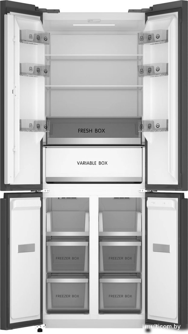 | Информация | - Четырехдверный холодильник RFQ 440 NFGB с инверторным компрессором и автоматической системой охлаждения No Frost — идеальный выбор для большой семьи. Стильный черный цвет, высота 192 см и ширина 703 мм делают его не только функциональным, но и привлекательным элементом кухни. Общий объем в 417 литров позволяет хранить множество продуктов. - Глубина 60 см обеспечивает легкую интеграцию в кухонный гарнитур, при этом достаточно оставить всего 6 мм расстояния до шкафов. Система нижнего отвода тепла предотвращает нагревание соседних поверхностей. Обновленная конструкция дверей и специальные петли позволяют открывать их на 90 градусов, что обеспечивает удобный доступ к содержимому. - Холодильник оснащен фантомным цветным дисплеем, который позволяет легко регулировать температуру и выбирать нужные режимы с помощью сенсорных кнопок. - Инверторный компрессор обеспечивает низкий уровень шума (до 38 дБ) и высокий класс энергоэффективности А+. Автоматическая система No Frost равномерно распределяет холодный воздух, предотвращая образование конденсата и наледи, что значительно упрощает уход за прибором. В случае отключения электричества морозильная камера сохраняет холод до 6 часов. - Режим «Суперохлаждение» быстро охладит большое количество продуктов, автоматически отключаясь через 120 минут при достижении температуры 2°С. Также его можно отключить вручную. Режим «Суперзаморозка» позволяет быстро заморозить продукты и автоматически выключается через 24 часа при достижении -32°С. - Функция энергосбережения автоматически устанавливает оптимальную температуру в зависимости от окружающей среды, что помогает снизить расходы на электроэнергию. В случае отключения питания холодильник запоминает предыдущие температурные режимы и восстанавливает их после подачи электричества. - Также предусмотрен ящик с индивидуальной зоной охлаждения, где можно установить нужную температуру — 0°С или -3°С, при общей температуре холодильного отделения от 2 до 9°С. |