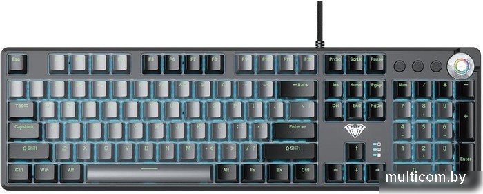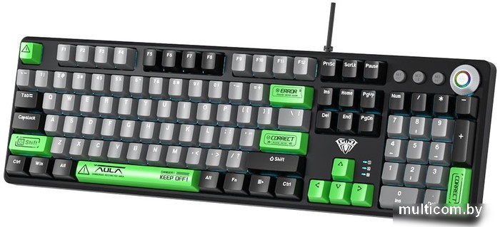 | Информация | ? Многоцветная подсветка кнопок и символов. ? Мультимедийные кнопки, совмещенные с F*. ? Дополнительные кейкапы зеленого цвета. ? Подключение кабелем Type-C-USB-A. ? Свитчи синего цвета. ? Роллер управления. ? Съемная верхняя панель. |
