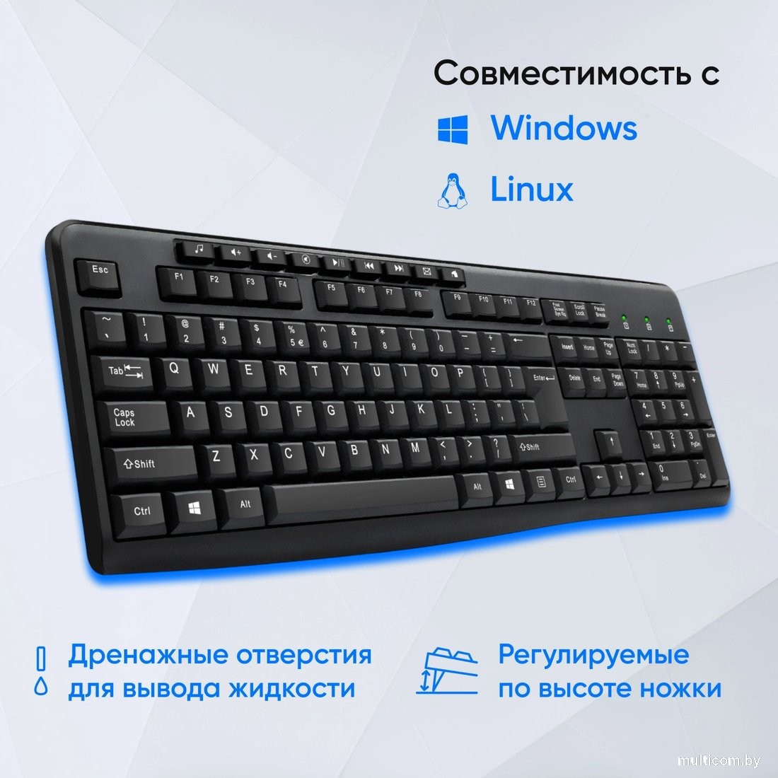| Информация | Эргономичная клавиатура с продуманной конструкцией для работы дома и в офисе. Девайс оборудован регулируемыми по высоте ножками. Дополнительные мультимедийные и офисные клавиши обеспячат быстрый доступ и управление нужными приложениями. |