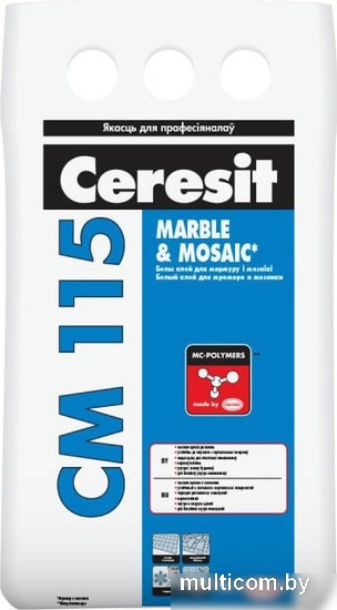 | Информация | Смесь Ceresit CM 115 предназначена для облицовки бетонных, кирпичных, цементно-песчаных или цементно-известковых поверхностей и других оснований плитами из мрамора и других светлых пород природного камня, а также мозаичными плитками, в т.ч. стеклянными.Смесь Ceresit CM 115 применяется по прочным недеформируемым основаниям на стенах и полах в жилищно-гражданском и промышленном строительстве внутри и снаружи зданий. Может применяться для облицовки бассейнов внутри помещений. |