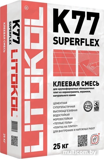 | Информация | SUPERFLEX K77 — клеевая смесь, предназначенная для уклад- ки любого типа плитки из керамогранита, керамики и натурального влагоустои?чивого камня, в том числе крупного формата. Для внутренних и наружных работ.SUPERFLEX K77 рекомендуется применять для облицовки поверхностеи?/конструкции?, подверженных умеренным деформациям в процессе эксплуатации:конструкции из гипсоволокнистых листов (ГВЛ), гипсокартона (ГКЛ);стекломагнезитовых листов (СМЛ);конструкции из сборного/монолитного железобетона;основания с гидроизоляциеи?, выполненнои? гидроизоляционными составами HIDROFLEX, ELASTOCEM, ELASTOCEM MONO, в ванных комнатах, в душевых, банях;существующие напольные либо настенные покрытия из старои? плитки (только внутри помещении?);основания, подверженных воздеи?ствию вибрационных нагрузок;террасы и эксплуатируемые кровли;«те?плые» полы;при облицовке стен и полов крупноформатными плитами из камня и керамогранита, в том числе тонкого;при облицовке фасадов и т. д. |