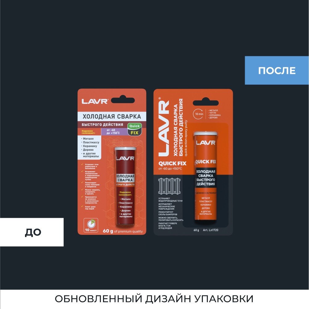 | Информация | - Lavr Холодная сварка 60г Ln1720 подходит для склеивания металлов, чугуна, керамики, дерева и полимерных материалов - Гарантирует крепкое соединение, не уступающее по прочности сварному шву - Высокая адгезия к влажным и замасленным поверхностям - Полностью затвердевает за 10 минут и достигает предельной прочности всего за 1 час - Температурный режим работы от -60 до +150°С - Устраняет водопроводные течи, исправляет механические повреждения - Ремонтирует сколы бамперов - Работает поверх влаги, ГСМ и под водой - Полностью затвердевший материал можно сверлить, полировать и красить |