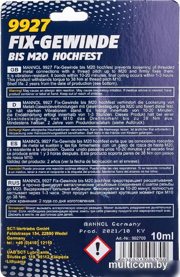 | Информация | Mannol Фиксатор резьбы 9927 10мл - это долговременное средство для фиксации всех типов резьб, обладающее сильной фиксацией. Оно предотвращает самоотвинчивание крепежа, даже при повышенных нагрузках и вибрации. Преимущества: - Полностью заполняет зазоры резьбы, герметизирует ее и предотвращает протечки через нее масла, воды, топлива, технических жидкостей и воздуха, а также коррозию. - Выдерживает сильные нагрузки и вибрации, поэтому может применяться в двигателях, трансмиссиях и коробках передач. - Подходит для фиксации подшипников, опорных болтов, штифтов и заглушек. - Может выдерживать крутящий момент до 38 Нм для резьбы М10. - Применимо на замасленных поверхностях и на резьбах с гальваническими покрытиями. Этот фиксатор резьбы идеально подходит для использования в автомобилях, мототехнике, коммерческой технике, а также в промышленности и быту. Он также может быть использован для герметизации резьбы и узких зазоров, а также как антикоррозионное средство. |