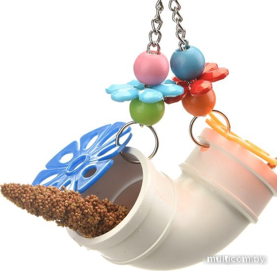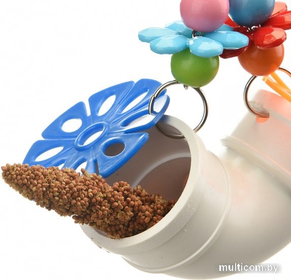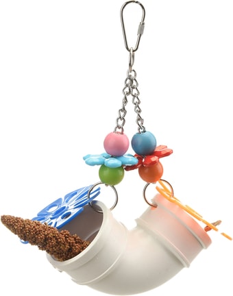 | Информация | Уголок ПВХ трубы отличное место для хранения запасов, но для их извлечения, необходимо приподнять яркий, пластиковый диск. Вы можете наполнять трубу по своему усмотрению, не только лакомствами, но и другими материалами, подходящими для разгрызания птицей. |