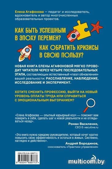 | Информация | Как быть успешным в эпоху перемен? Как обратить кризисы в свою пользу? На эти и другие вопросы даст ответ новая книга Елены Агафоновой, педагога и исследователя, вдохновителя и автора многочисленных образовательных проектов. Книга мягко проводит читателя через четыре последовательных этапа, составляющих естественный «пазл обновления» вашей реальности: расслабление, наблюдение, исследование и эксперимент. За легкими, полными позитива историями и действенными практиками на каждый день скрывается глубокое и целостное понимание мощных законов природы, принципов поступательного развития человеческого сознания. |