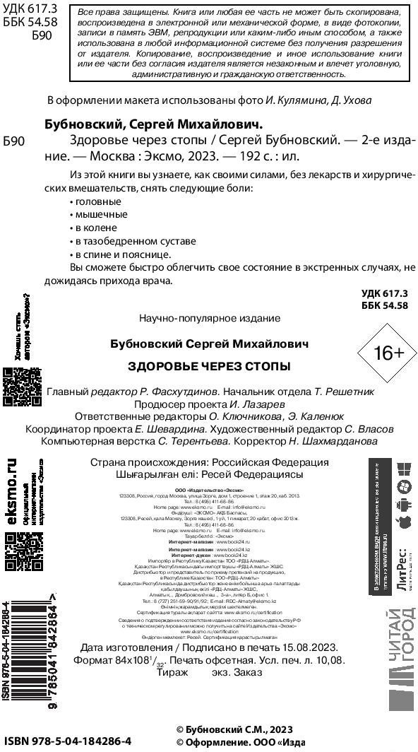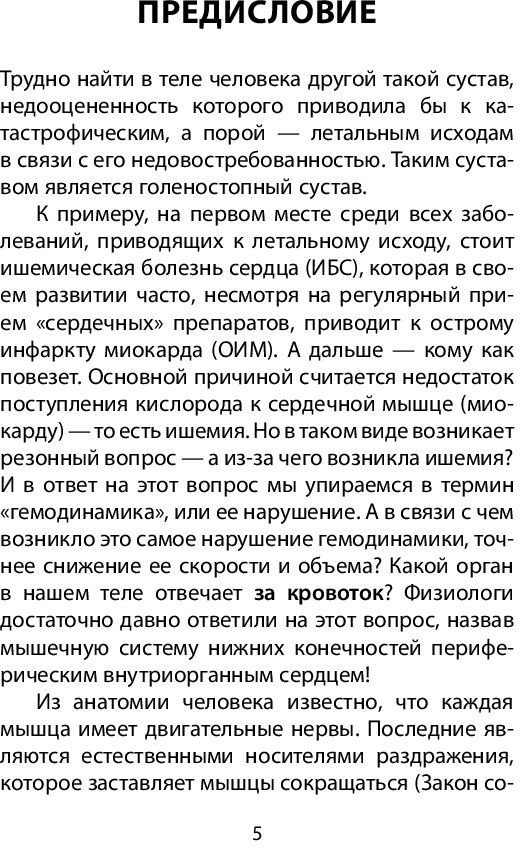| Информация | Здоровье начинается с ног. И это не метафора, это физиология. Ведь ноги — это движение. А пока мы ходим, мы оздоравливаем свой организм. В своей новой книге доктор Бубновский касается ключевых вопросов здоровья ног. Знали ли вы, например, что во время ходьбы (не бега!) мышцы поддерживают вены и восстанавливают их — в результате можно забыть о варикозе. И, наоборот, при длительном сидении кровоток в районе тазовых костей перекрывается — в результате отеки, боли и деформация вен. Автор предлагает различные упражнения с применением и без применения специального оборудования:При бытовых травмах голеностопного сустава. При подагре, или «косточке». При головных болях и сильных отеках. При реабилитации после спортивных травм. В своей новой книге доктор медицинских наук, профессор С.М. Бубновский, автор принципиально новой системы снятия болей и восстановления здоровья без лекарств и операций, рассказывает о том, как восстановить здоровье стопы и сохранить его на долгие годы. |
