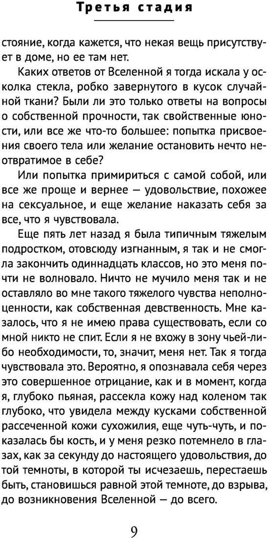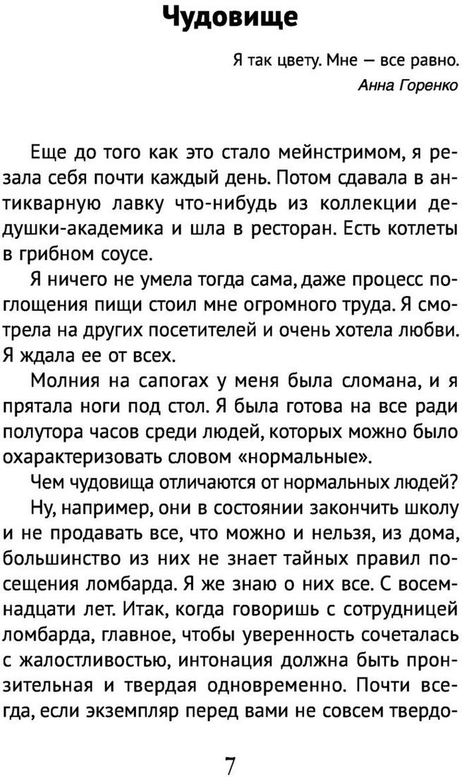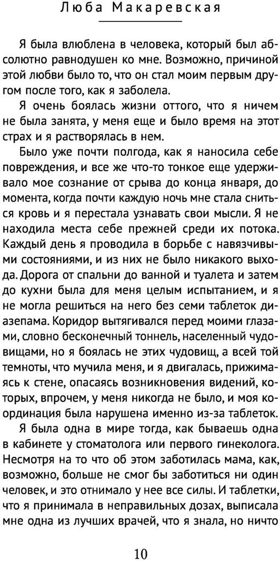 | Информация | - В этой книге собраны рассказы о женской сексуальности и влечении к смерти, внутри них любовное и эротическое рассматривается всегда как экзистенциальное переживание. Это глубокая и тонкая проза о психологии женщины, ее восприятии телесности, исследование внутренних конфликтов, границ, чувствительности, стыда и страха. Перед вами предельно откровенная работа о том, что обычно замалчивается, затирается, пересказывается шепотом. - «Люба Макаревская пишет о боли, смерти, любви и памяти так, словно одалживает читателю свой взгляд, тело и какой-то крохотный мерцающий фрагмент души; читая ее, всегда находишься внутри чего-то, что одновременно "я" и "не я". Ее удивительный дар описывать душевную диссоциацию без диссоциации текстовой, оставаясь внутри и одновременно снаружи — своего рода волшебный эффект снежного шара. Люба пишет острыми снежинками и собственной кровью на этом стекле свои послания нам и миру — читать их немного больно, но эта боль исцеляет». — Татьяна Замировская, автор романа «Смерти. net» - «Если представить себе, что все тени сходятся в одной точке, будет ли эта точка только невозможностью любой правды? И не хочу ли я в конце концов, чтобы огонь стер мою жадность вместе с ненасытностью моего зрения? И я снова, лежа на кровати, закрываю глаза и заключаю во тьму мир и храню в себе взгляды, кожу и мимику других — всех тех, с кем я была связана последние месяцы, и я наконец исчезаю. Мое зрение становится больше меня самой, оно зачеркивает меня, словно морская волна в преддверии то ли ядерной войны, то ли русской зимы, что для сознания почти всегда одно и то же». |