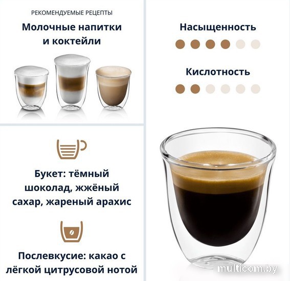 | Информация | Уникальный бленд кофе из Латинской Америки, созданный специально для автоматических кофемашин DeLonghi. Учитывает особенности приготовления: температуру, давление и процесс заваривания. Смесь обладает классическим кофейным вкусом: мягким орехово-шоколадным букетом с оттенками жареного хлеба и легким цитрусовым послевкусием. Подойдет для приготовления эспрессо, американо и молочных напитков. |