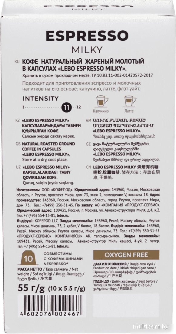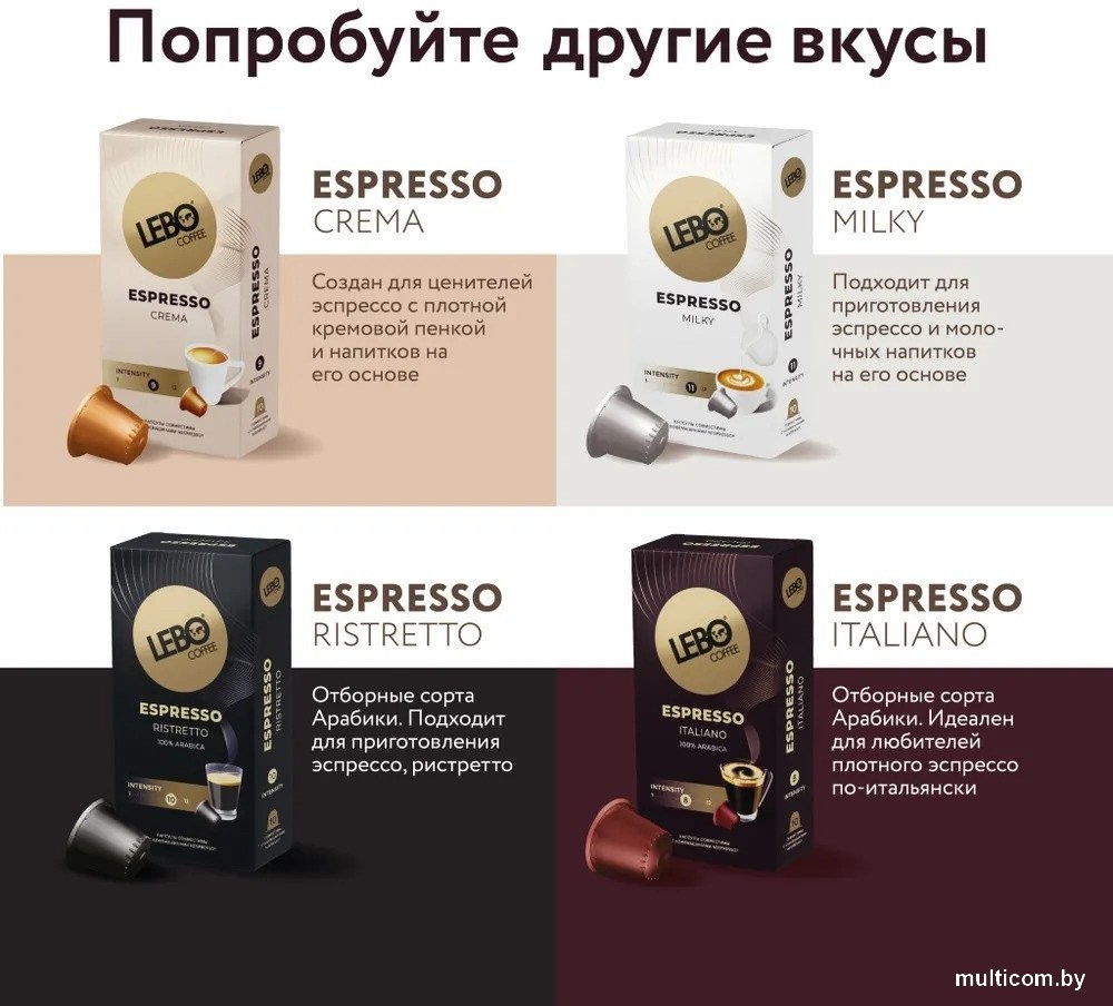 | Информация | - Кофе в капсулах Lebo Espresso Milky - натуральный кофе темной степени обжарки с притягательной горчинкой. - Подходит для приготовления эспрессо и кофейных напитков на его основе: капучино, латте, флэт уайт. - Насыщенный вкус с оттенками горького шоколада, орехов и карамели. |