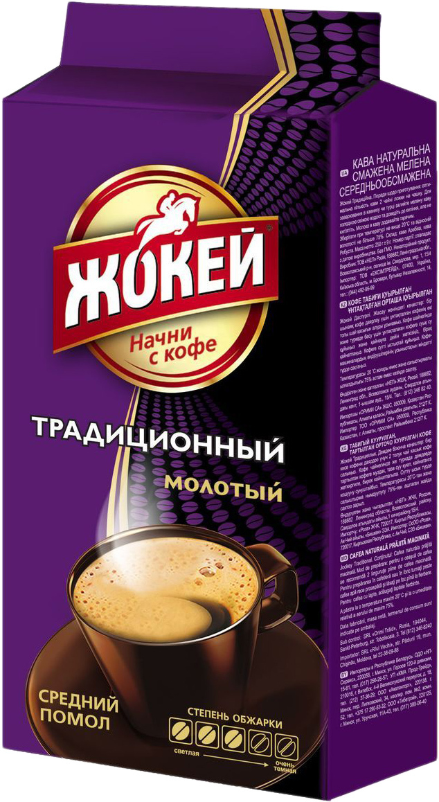 | Информация | Молотый кофе Жокей Традиционный - густой и насыщенный кофе, с приятной горчинкой и легким сладковатым оттенком. Смесь зерен позволяет создать композицию, адресованную любителям настоящего крепкого кофе. |
