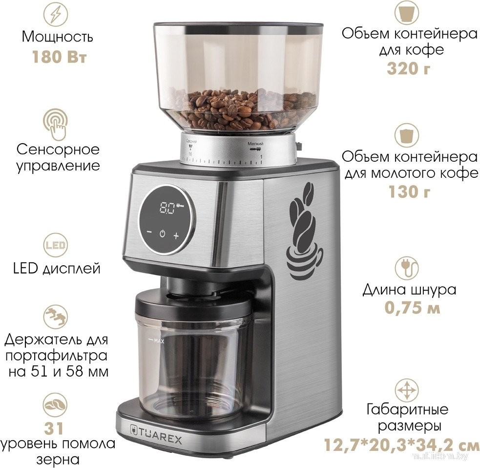 | Информация | - Погрузитесь в мир истинного кофейного искусства с кофемолкой TUAREX TK-4301. Этот изысканный прибор создан для ценителей настоящего вкуса, где каждый момент приготовления кофе становится уникальным. - Мощность 180 Вт и съемные стальные конические жернова обеспечивают идеальный помол для вашего кофе. 31 уровень помола позволяет выбрать идеальную текстуру кофейного порошка. - Стальной цвет придает кофемолке элегантность, а компактные размеры позволяют ей легко вписаться в любое пространство на вашей кухне. - Сенсорное управление делает использование кофемолки максимально удобным и приятным процессом. - Держатель для портафильтра на 51 и 58 мм предоставляет возможность молоть кофе непосредственно в портафильтр, как настоящий бариста. Легко подходят как стандартные портафильтры на 51 мм, так и профессиональные на 58 мм. |