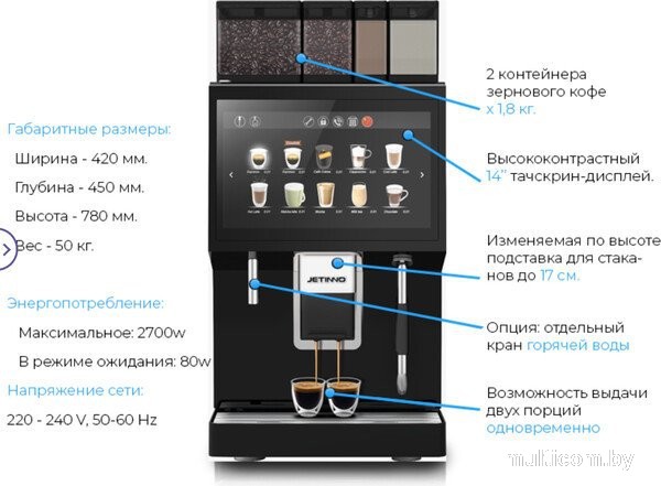| Информация | -Кофемашина Jetinno JL 35 – это суперавтоматическая модель, созданная для премиальных кофекорнеров, а также индустрии HoReCa и офисных пространств. Благодаря передовым технологиям Jetinno и европейским традициям, аппарат сочетает в себе высокую производительность и удобство использования, что делает его отличным выбором для профессионального применения. Модель оснащена интуитивно понятным дисплеем и электронным управлением, позволяющим готовить любимые напитки быстро и без лишних усилий. -Встроенный капучинатор обеспечивает автоматическое приготовление напитков с натуральным молоком, позволяя получать эспрессо, американо, капучино, латте, чай, молочную пену и кофе с молоком одним нажатием. Качество напитков соответствует уровню профессиональных бариста, что особенно важно для коммерческих заведений и требовательных пользователей. -Кофемашина работает с зерновым кофе, имеет вместительный отсек для зерен на 1800 г и резервуар для воды объемом 0.7 л. Аппарат позволяет готовить сразу две чашки кофе, а автоматическая промывка и функция подачи горячей воды обеспечивают простоту в обслуживании и уходе. Несмотря на отсутствие регулировки степени помола, предусмотрена регулировка объема порции воды. -Jetinno JL 35 выполнена из прочного пластика в классическом черном цвете, обладает внушительными размерами и весом, что свидетельствует о ее профессиональной направленности. Благодаря высокой мощности 2700 Вт и широкому набору программ приготовления, эта кофемашина станет надежным инструментом для приготовления разнообразных кофейных напитков в больших объемах. |