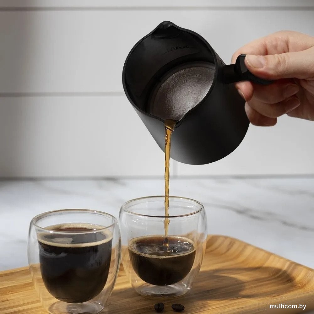 | Информация | Электрическая турка КТ-7494 варит кофе по-турецки. С ней вы сможете быстро и легко сварить натуральный кофе на 4 чашки по 60 мл. Также с помощью турки вы можете вскипятить воду или подогреть молоко. Кофе по-восточному или кофе по-турецки — кофе, приготовленный путем варки мелкомолотых зёрен кофе в воде. Чтобы сварить кофе по-турецки, в турку засыпают молотый кофе, заливают воду и нагревают её почти до кипения. На верхней части базы находится кнопка «Вкл/Выкл» со световым индикатором. Индикатор кнопки «Вкл/Выкл» горит синим в режиме ожидания или красным во время приготовления. У турки 2 носика, это сделано специально, чтобы вам было удобно наливать кофе в чашку вне зависимости от того, правша вы или левша. Ручка турки пластиковая, не нагревается и удобно лежит в руке. В электрической турке КТ-7494 процесс варки кофе автоматизирован. Турка отключается после закипания кофе. Чтобы пенка не перелилась через край, у турки есть датчик температуры. Как только пенка коснётся датчика, устройство отключится. Турка рассчитана на приготовление до 4-х порций кофе. Мерная ложка поможет отмерить и засыпать нужное количество молотого кофе. Турка выполнена в ярком привлекательном дизайне и обязательно украсит вашу кухню! |