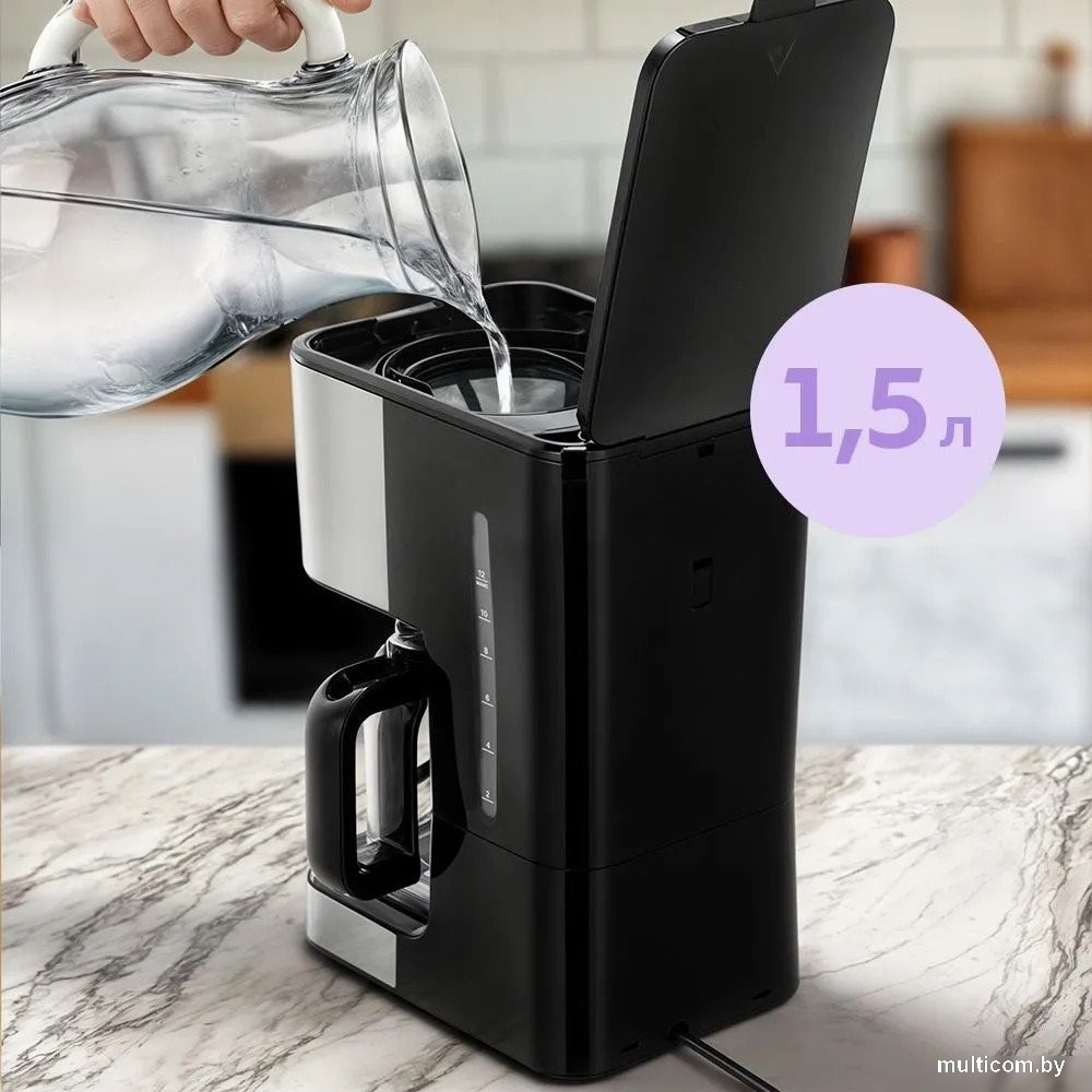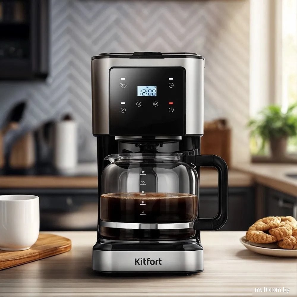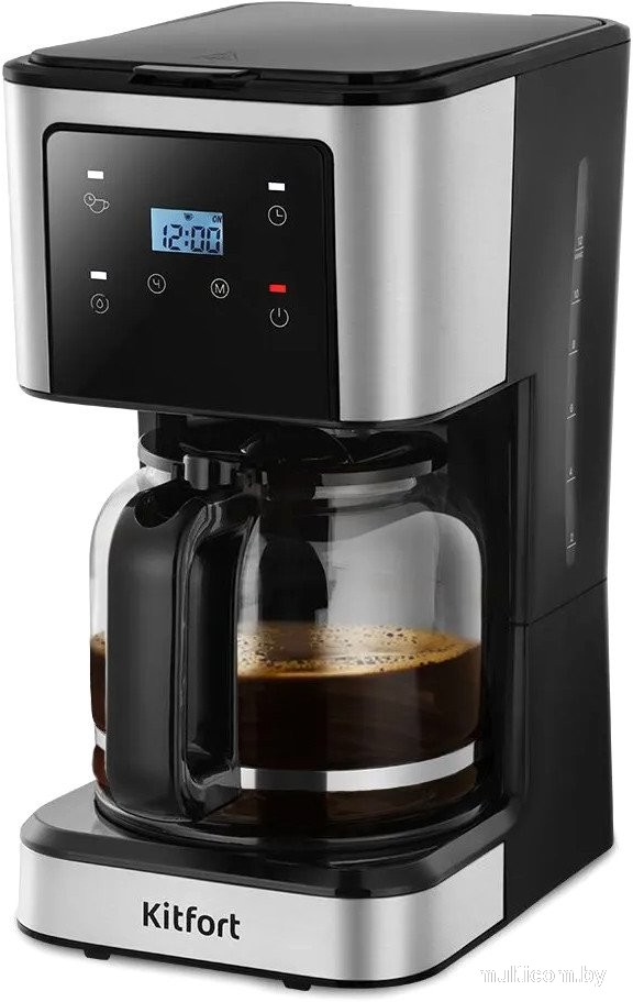 | Информация | - Капельная кофеварка КТ-7628 готовит ароматный чёрный кофе из молотых зёрен. Управление осуществляется с помощью кнопок на панели, а текущее время отображается на дисплее. Это идеальное устройство для приготовления кофе как дома, так и в офисе. - Кнопка «Крепкий кофе» активирует режим приготовления насыщенного кофе, при этом загорается индикатор. После завершения процесса автоматически включается подогрев платформы на 2 часа. Функция «Автозапуск» позволяет установить время отложенного старта, чтобы кофе был готов к нужному моменту. - Резервуар для воды вмещает 1,5 л, что позволяет за один раз приготовить до 12 чашек (по 120 мл). На резервуаре и кофейнике есть отметки, что упрощает процесс приготовления нужного количества кофе. - Подогрев платформы автоматически активируется на 2 часа после использования режима «Крепкий кофе». Нагреватель бойлера также служит для подогрева платформы. - Фильтр из нейлона вмещает до 90 г кофе и может использоваться многократно. Разборная конструкция облегчает его очистку, а мерная ложечка помогает точно отмерить количество кофе. - Вода из резервуара поступает в бойлер под собственным весом, где закипает. Образующийся пар создаёт давление, благодаря которому вода смешивается с кипящей и подаётся в фильтр, а затем в кофейник. - Воронка кофеварки оснащена противокапельной системой, которая останавливает подачу кофе при извлечении кофейника. Это позволяет наливать кофе в чашку, не дожидаясь завершения приготовления. - Кофейник из стекла имеет отметки, показывающие количество оставшихся порций, что удобно для контроля запаса. Ёмкость кофейника и резервуара для воды составляет 1,5 л, что обеспечивает комфортное использование. |