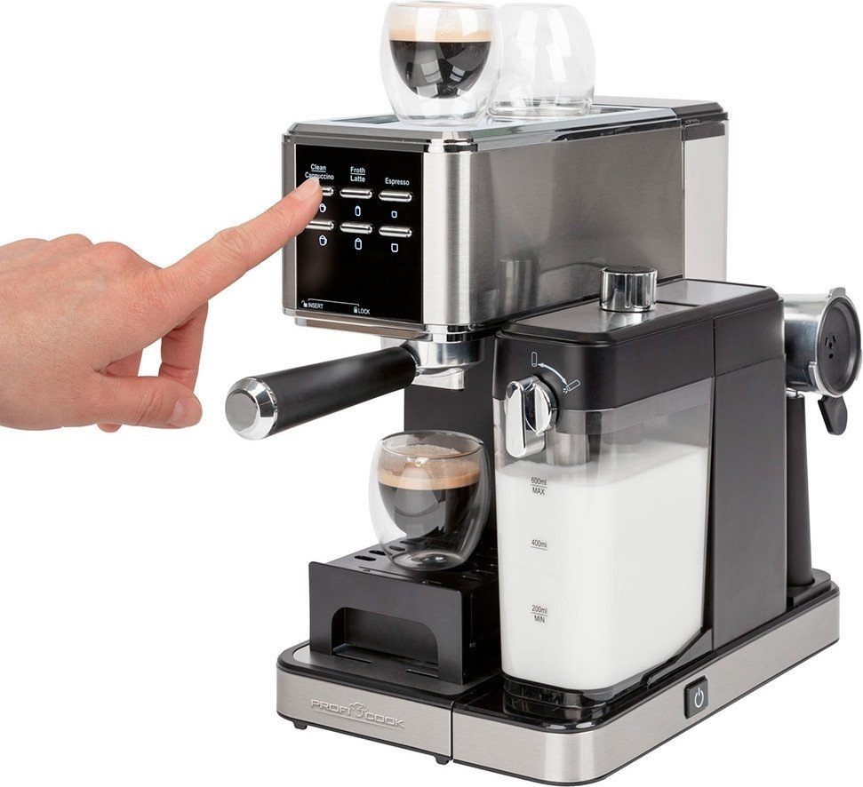 | Информация | - Эспрессо-кофемашина ProfiCook PC-ES-KA 1266 — идеальный выбор для любителей кофейных напитков. Она позволяет готовить эспрессо, ристретто, латте, капучино и американо с легкостью и удобством. - С помощью одной кнопки вы сможете наслаждаться капучино и латте маккиато. Корпус из нержавеющей стали обеспечивает долговечность и стильный внешний вид. Итальянская помпа создает давление до 20 бар, что гарантирует насыщенный вкус вашего кофе благодаря функции предварительного заваривания. - В комплекте идут два высококачественных литых алюминиевых портафильтра: один для традиционного эспрессо, другой — для капсул, совместимых с Nespresso. Это делает кофемашину универсальным решением для всех любителей кофе. - Резервуар для молока объемом 0,6 литра съемный и безопасен для мытья в посудомоечной машине. Встроенная функция вспенивания молока позволяет легко готовить теплое молоко, а количество молочной пены можно регулировать с помощью поворотного регулятора. - Поворотная насадка для молока из нержавеющей стали и индивидуально программируемое количество кофе делают процесс приготовления еще более удобным. Кофемашина также подходит для приготовления кофе со льдом, что расширяет ваши возможности. - Платформа для подогрева чашек и выдвижная подставка для чашек разных размеров обеспечивают комфорт в использовании. Резервуар для воды объемом около 1,2 литра съемный, а поддон для сбора капель с решеткой из нержавеющей стали легко чистится. - Кнопки управления из нержавеющей стали с подсветкой и ножки с присосками добавляют удобства и безопасности в использовании. В комплекте вы найдете портафильтр с двумя вставками для одной и двух чашек, мерную ложку для кофе, тампер и адаптер для капсул, совместимых с Nespresso. Эта кофемашина станет отличным дополнением к вашей кухне и поможет вам наслаждаться любимыми кофейными напитками каждый день! |