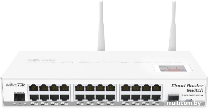 | Информация | CRS125-24G-1S-2HnD-IN - это L3-коммутатор, функционирующий под управлением стандартной RouterOS v6 L5. Также может работать как беспроводная 2.4GHz 802.11n MIMO 2x2 1000mW точка доступа с антеннами 4dbi. Оснащен сенсорным экраном LCD, возможно подключение USB 3G/4G модема |