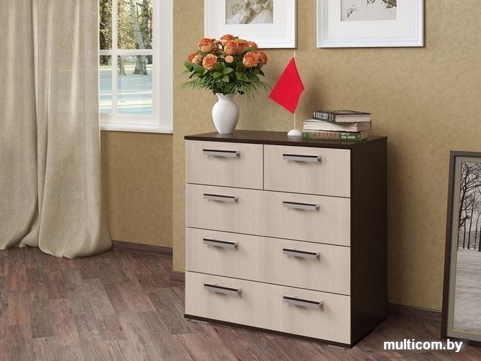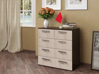 | Информация | Практичный, компактный и функциональный комод «Стандарт 5» состоит из пяти выдвижных ящиков различной вместимости. Модель оборудована тремя большими и двумя ящиками меньшего размера. Оригинальность этой модели придает разделенный на две равные части верхний ящик. Поверхность комода можно использовать в качестве подставки под телевизор, или украсить декором. |