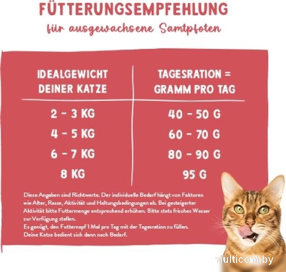 | Ингредиенты | свежее мясо курицы, белок из птицы, животный жир, шкварки, картофельный крахмал, гороховый крахмал, белковый гидролизат, сушеный свекольный жом, тапиока, картофельный белок, яблочная барда, семена льна, масло лосося, мука, цикорий, горох, шелуха семян подорожника, дрожжи, хлорид калия, карбонат кальция, ягоды брусники, ягоды голубики, зеленые мидии, цветы календулы, юкка |
