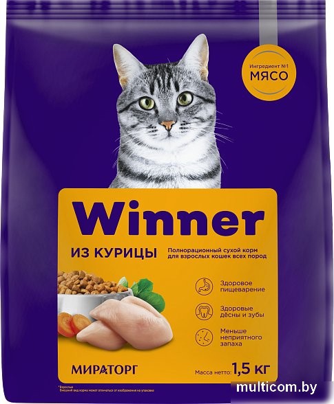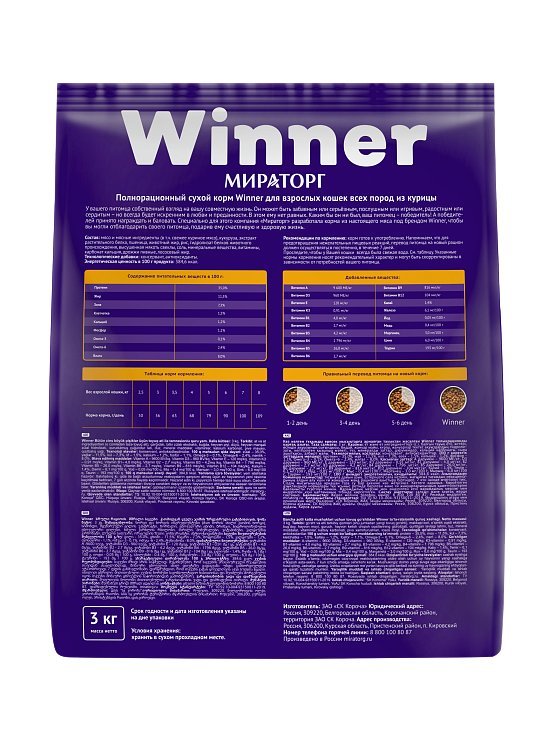 | Ингредиенты | мясо и мясные ингредиенты (в т.ч. свежее куриное мясо), кукуруза, экстракт растительного белка, пшеница, животный жир, рис, гидролизат белков животного происхождения, высушенная мякоть свеклы, соль, минеральные вещества, витамины, карбонат кальция, дрожжи пивные, лососевый жир |