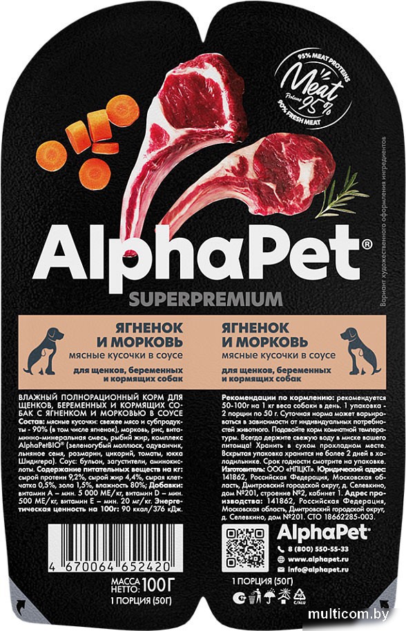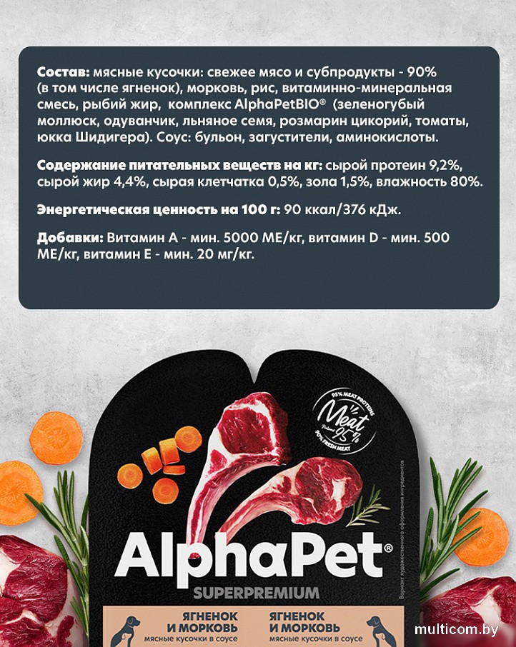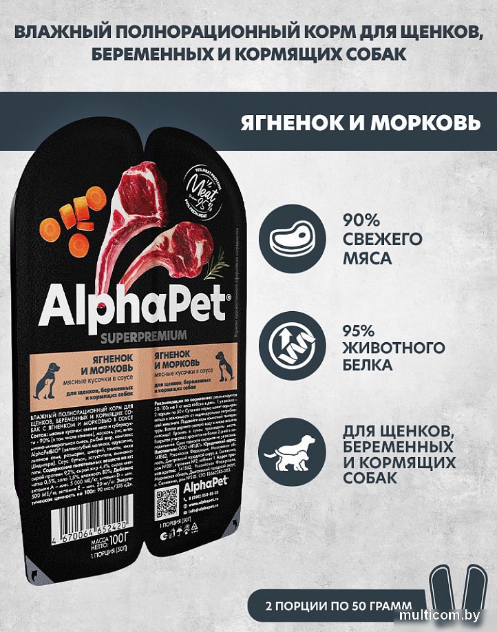 | Информация | - Влажный полнорационный корм для щенков, беременных и кормящих собак с ягненком и морковью в соусе. - Особенности: 95% мясного протеина; 90% свежего мяса; низкозерновая рецептура; без пшеницы, сои, кукурузы; высшая категория качества Holistiс (холистик); натуральные ингредиенты; не содержит ГМО, искусственных красителей и ароматизаторов; бережная технология, сохраняющая вкусовые и питательные свойства свежего мяса; уникальный комплекс натуральных добавок «AlphaPetBIO». - Состав: свежее мясо и субпродукты — 90% (в том числе ягненок), морковь, рис, витаминно–минеральная смесь, комплекс «AlphaPet BIO» (зеленогубый моллюск, одуванчик, льняное семя, розмарин, цикорий, томаты, Юкка Шидигера). Соус: бульон, загустители, аминокислоты. - Содержание питательных веществ на 1 кг: сырой протеин — 9.2%, сырой жир — 4.4%, сырая клетчатка — 0.5%, зола — 1.5%, влажность — 80%. - Добавки: витамин А — мин. 5000 МЕ/кг, витамин D — мин. 500 МЕ/кг, витамин E — мин. 20 мг/кг. - Рекомендации по кормлению: рекомендуется 50–100г на 1 кг веса собаки в день. 1 упаковка — 2 порции по 50 г. Суточная норма может варьироваться в зависимости от индивидуальных потребностей животного. Подавайте корм комнатной температуры. Всегда держите свежую воду в миске вашего питомца! Хранить в сухом прохладном месте. Вскрытая упаковка хранится не более 2 дней в холодильнике. |