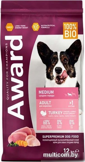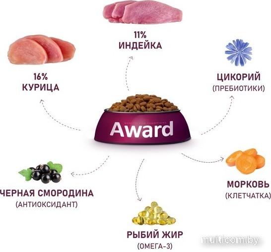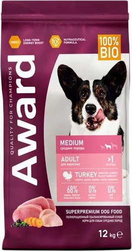 | Информация | ? Корм Award Adult Medium для взрослых средних пород с индейкой, курицей, морковью и черной смородиной 12 кг изготовлен из 100% натуральных ингредиентов по инновационной формуле, обеспечивающей комплексную нутрицевтическую поддержку организма питомца. ? Технология 3NRGY, используемая при изготовлении корма, сочетает полезные углеводы, обеспечивая длительный запас энергии и чувство сытости. ? Корм обогащен полиненасыщенными жирными кислотами, улучшающими качество шерсти и укрепляющими иммунитет. ? Пробиотики и пребиотики помогают сохранять естественный баланс кишечной микрофлоры и способствуют оптимальному усвоению питательных веществ. ? Добавленная в состав морковь является отличным источником клетчатки, улучшающим работу ЖКТ. ? Корм не содержит красителей и консервантов. |