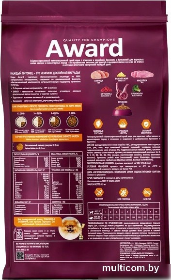 | Информация | - Сухой корм для взрослых собак мелких и миниатюрных пород с ягненком и индейкой с добавлением брокколи и брусники обеспечивает комплексную нутрицевтическую поддержку организма питомца. - При изготовлении корма использовалась технология «3NRGY» — сочетание полезных углеводов, дающее длительный запас энергии и чувство сытости. - Корм обогащен полиненасыщенными жирными кислотами, которые повышают качество шерсти и укрепляют иммунитет. - Пробиотики и пребиотики помогают сохранять естественный баланс кишечной микрофлоры и способствуют оптимальному усвоению питательных веществ. - В состав добавлена брокколи — отличный источник клетчатки, улучшающий работу ЖКТ. - Без красителей и консервантов. - Рекомендации по кормлению: рекомендуемую ежедневную порцию корма можно разделить на два кормления. Индивидуальные потребности в питании могут отличаться в зависимости от размера, возраста и активности питомца. - Корм предназначен исключительно для домашних животных и не предназначен для употребления в пищу человеком. |