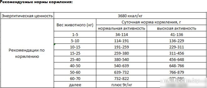 | Питательные вещества | витамин А 20000 МЕ; витамин Д 1800 МЕ; витамин Е 300 мг; витамины группы В 2100 мг; витамин С 50 мг; пантотеновая кислота 20 мг; ниацин 22 мг; железо 50 мг; медь 12 мг; цинк 150 мг; йод 4,0 мг; селен 0,2 мг; марганец 20 мг; глюкозамин 450 мг/кг; хондроитин 250 мг/кг; L-карнитин 500 мг/кг |
