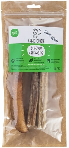 | Информация | Пенис бычий сушеный — одно из самых любимых лакомств всех собак. Бычий пенис представлен 3-мя средними кусочками, нарезанными по 23 см. Пенис высушен без добавок, красителей, консервантов и ароматизаторов, что делает его не только вкусным, но и полезным угощением. |