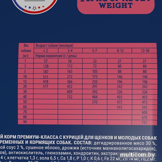 | Ингредиенты | дегидрированное мясо 30%, в том числе мясо курицы 14%, пшеница, кукуруза, жир куриный, глютен кукурузный, мясной соус 2 %, сушеное яблоко, дрожжи (источник маннанолигосахаридов), витаминно-минеральный комплекс, топинамбур (инулин - источник фруктоолигосахаридов), антиокислитель, глюкозамин, хондроитин, экстракт юкки Шидигера, экстракт розмарина. |
