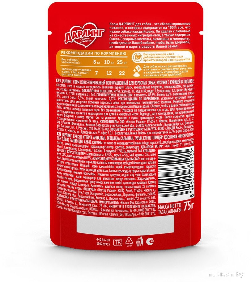 | Информация | Это сбалансированное питание, в котором содержится на 100% все, что нужно собаке каждый день. Он сделан с любовью из качественных ингредиентов, а также содержит Омега-3 жирные кислоты, витамины и минералы, необходимые Вашей собаке, чтобы быть здоровой, активной и дарить радость Вашей семье._x000D_ _x000D_ Без красителей и без добавления искусственных ароматизаторов и консервантов._x000D_ Влажный корм для собак «Курица в подливе» (75 г) — повседневное питание, разработанное для взрослых собак всех пород. Основные ингредиенты включают злаки и мясные компоненты, включая курицу, что обеспечивает высокую питательную ценность и привлекательный вкус. Корм предназначен для поддержания здоровья и активности животных._x000D_ _x000D_ Особенности:_x000D_ Высокое содержание белка из курицы._x000D_ Сбалансированное питание для взрослых собак всех пород._x000D_ Подходит для повседневного использования._x000D_ Удобная упаковка пауч весом 75 г._x000D_ _x000D_ Корм обеспечивает необходимое количество питательных веществ для поддержания здоровья и активности взрослых собак. Удобная упаковка позволяет легко хранить и дозировать корм, а высокое содержание белка способствует поддержанию мышечной массы. Сбалансированная формула улучшает пищеварение и общее самочувствие животных. |
