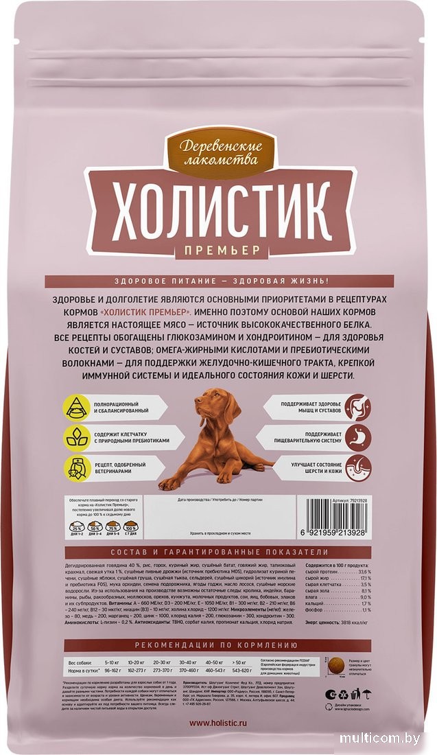 | Информация | Здоровье и долголетие являются основными приоритетами в рецептурах кормов «Холистик премьер». Именно поэтому основой кормов является настоящее мясо — источник высококачественного белка. Все рецепты обогащены глюкозамином и хондроитином — для здоровья костей и суставов; омега–жирными кислотами и пребиотическими волокнами — для поддержки желудочно–кишечного тракта, крепкой иммунной системы и идеального состояния кожи и шерсти._x000D_ Состав: дегидрированная говядина 40%, рис, горох, куриный жир, сушеный батат, говяжий жир, тапиоковый крахмал, свежая утка 1%, сушеные пивные дрожжи (источник пребиотика MOS), витаминно-минеральный комплекс (А, D3, E, B1, B2, B6, B12, ниацин (B3), холина хлорид, железо, медь, марганец, цинк, хлорид калия, глюкозамин, хондроитин, L–лизин), гидролизат куриной печени, сушеные яблоки, сушеная груша, сушеная тыква, сельдерей, сушеный цикорий (источник инулина и пребиотика FOS), мука орхидеи, семена подорожника, ягоды годжи, масло лосося, сушеные морские водоросли. Из–за использования на производстве возможны остаточные следы: кролика, индейки, рыбы, ракообразных, моллюсков, орехов, кунжута, молочных продуктов, сои, яиц, бобовых, злаков и их субпродуктов._x000D_ Гарантированные показатели: сырой протеин — 31%,сырой жир — 17.6%, сырая клетчатка — 3.5%, сырая зола — 8.1%, влага — 9%, кальций — 1.8%, фосфор — 1.1%, магний — 0.1%, омега-3 — 0.2%, омега-6 — 2.8%._x000D_ Витамины: витамин А — 20400 МЕ/кг, витамин D3 — 629 МЕ/кг, витамин E — 51.9 МЕ/кг._x000D_ Микроэлементы: железо — 309 мг/кг, медь — 17.5 мг/кг. марганец — 73.1 мг/кг. цинк — 116 мг/кг, медь — 17.5 мг/кг, марганец — 73.1 мг/кг. цинк — 116 мг/кг, йод — 1.1 мг/кг, селен — 0.4 мг/кг._x000D_ Антиоксиданты: TBHQ, сорбат калия, пропионат кальция, хлорид натрия._x000D_ Рекомендации по кормлению: разработаны для взрослых собак от 1 года. Разделите суточную норму корма на количество кормлений в день и давайте равными частями. Потребности каждой собаки могут отличаться в зависимости от возраста и уровня активности. Щенкам, беременным и кормящим необходима особая диета. Используйте рекомендации как основу и адаптируйте их под потребности вашего питомца. Всегда следите за наличием чистой питьевой воды в открытом доступе. Обеспечьте плавный переход со старого корма на «Холистик Премьер», постепенно увеличивая долю нового корма до 100% к седьмому дню. |