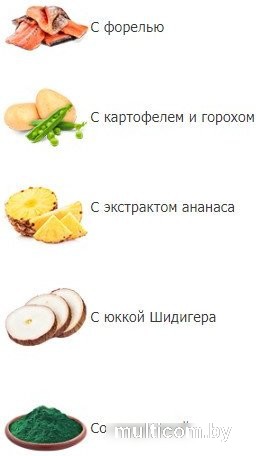 | Ингредиенты | гороховый крахмал, дегидрированный горох, форель, гороховый протеин, дегидрированный картофель, жир животного происхождения, дегидрированные белки форели, льняное семя, минеральные вещества, кукурузное масло, сухой экстракт корня цикория, лигноцеллюлоза, спирулина, сухой экстракт стебля ананаса, сухой экстракт юкки |