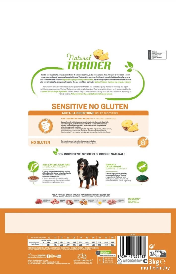 | Информация | - Полноценный и сбалансированный корм, специально разработанный для взрослых собак средних и крупных пород. - Преимущества корма включают поддержку пищеварения, отсутствие глютена и формулу с животным монопротеином. - Состав: дегидрированные свиные белки (19.5%), цельная кукуруза (19%), кукурузная мука «fioretto», дегидрированный горох, рисовые отруби, сало, свинина (4%), коричневый рис (4%), льняное семя (3%), гидролизованный гороховый белок, рис, минералы, кукурузное масло, сушеный концентрат корня цикория (0.7%), лигноцеллюлоза, сушеный концентрат стебля ананаса (0.1%), спирулина (0.02%). - Аналитические компоненты: сырой протеин (24%), сырой жир (13.5%), сырая клетчатка (3%), сырая зола (7%), омега–3 (1%). - Пищевые добавки: витамин A (27000 МЕ), витамин D3 (1200 МЕ), витамин E (650 мг), пентагидрат сульфата меди(II) (33 мг), моногидрат сульфата железа(II) (260 мг), йодид калия (1.9 мг), селенит натрия (0.2 мг), моногидрат сульфата цинка (405 мг), моногидрат сульфата марганца (123 мг). Сенсорные добавки: экстракт олибанума (310 мг). - Может содержать следы других животных белков. - В продаже также доступны ветеринарные препараты для заботы о здоровье вашего питомца. Переходите по ссылке, чтобы ознакомиться с ассортиментом. |