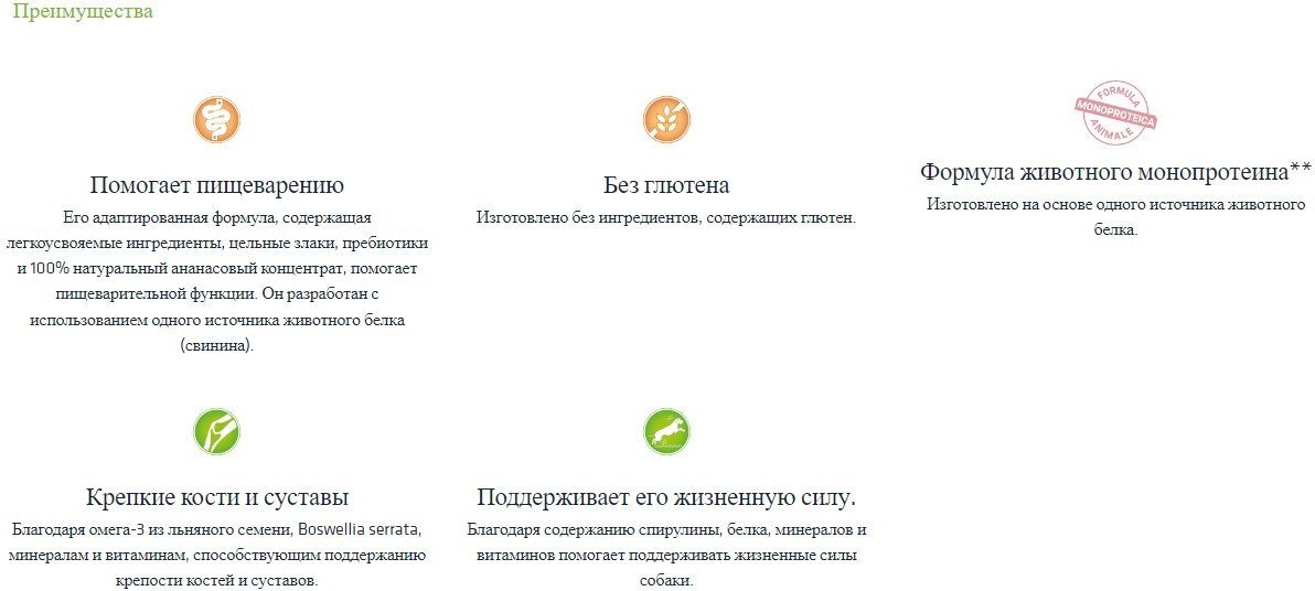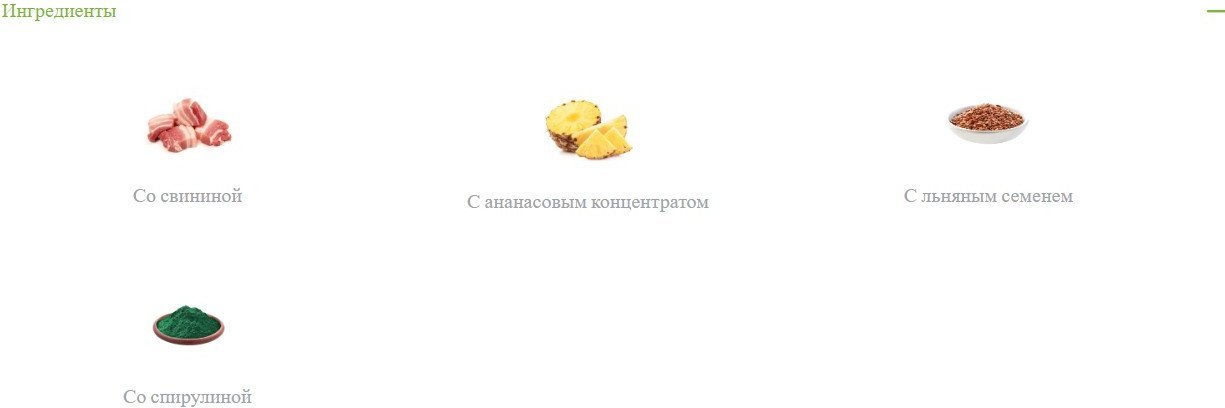| Ингредиенты | дегидрированные свиные белки, цельная кукуруза, кукурузная мука, дегидрированный горох, рисовые отруби, сало, свинина, коричневый рис, льняное семя, гидролизованный гороховый белок, рис, минералы, кукурузное масло, сушеный концентрат корня цикория, лигноцеллюлоза, сушеный концентрат стебля ананаса, спирулина |