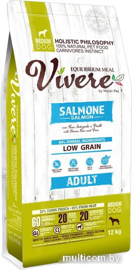 | Ингредиенты | дегидрированные белки мяса лосося (26%), свежее мясо лосося (20%), бурый рис (20%), гороховый крахмал, жир индейки и курицы (11%), горошек, кормовые бобы, семена льна (3%), гидролизованный белок печени (3%), суш. мякоть свеклы, дрожжи, мука морских водорослей (0,3%), дрожжевые продукты (MOS 0,2%), Юкка Шидигера (0,03%), суш. кожура граната (0,02%), семена расторопши (0,02%), суш. яблоко (0,02%), суш. цветки гибискуса (0,016%), суш. плоды шиповника (0,002%). |