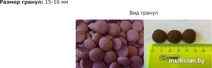 | Ингредиенты | Обезвоженные мясо и мясные ингредиенты – 31% (в том числе: говядина – 50%, телятина – 35%, домашняя птица), рис, отруби пшеничные, маис, животный жир, рыбий жир, экстракт пивных дрожжей (источник MOS), витаминно-минеральный комплекс (витамины: A – 12000 МЕ/кг., D3 – 1200 МЕ/кг., E – 300 мг/кг., B1, B2, ниацин (B3), холина хлорид (B4), пантотеновая кислота (B5), B6, фолиевая кислота (B9), B12, бетаин, C, биотин (H) |
