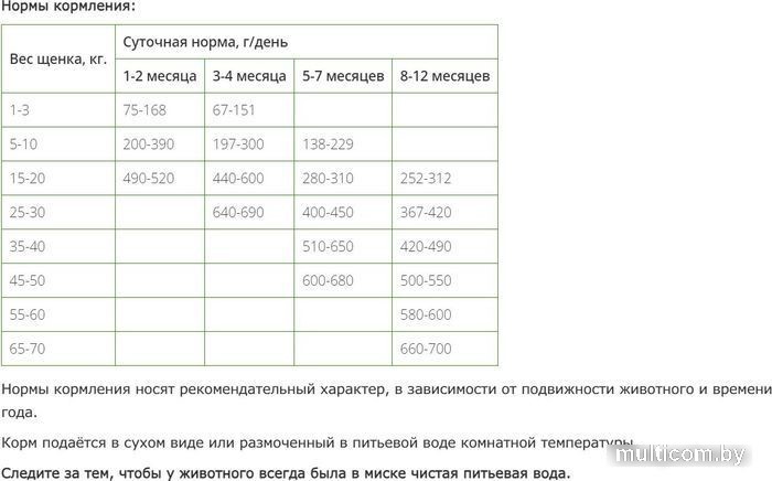 | Ингредиенты | Обезвоженные мясо и мясные ингредиенты – 40% (в том числе: утка – 8%, домашняя птица), рис, отруби пшеничные, маис, животный жир, рыбий жир, экстракт пивных дрожжей (источник MOS), витаминно-минеральный комплекс (витамины: A – 18000 МЕ/кг., D3 – 1500 МЕ/кг., E – 400 мг/кг., B1, B2, ниацин (B3), холина хлорид (B4), пантотеновая кислота (B5), B6, фолиевая кислота (B9), B12, бетаин, C, биотин (H); минералы и аминокислоты: Ca – 1,2%, P – 1,0%, Na, Mg, K, Mn, Fe, Co, Cu, Zn, Se, Mo, I, лизин, метионин, цистин, триптофан), глюкозамина сульфат – 750 мг/кг., хондроитина сульфат – 150 мг/кг., Юкка Шидигера, токоферол. |