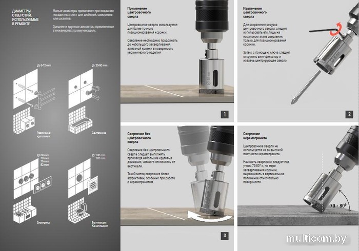 | Информация | Коронка алмазная с центрирующим сверлом используется для сверления керамогранита, керамической плитки, изделий из керамики. Тонкая режущая кромка для быстрого и чистого сверления. Алмазное покрытие и перфорированный наконечник обеспечивают долгий срок службы при обработке самой твердой керамической плитки и керамогранита. |