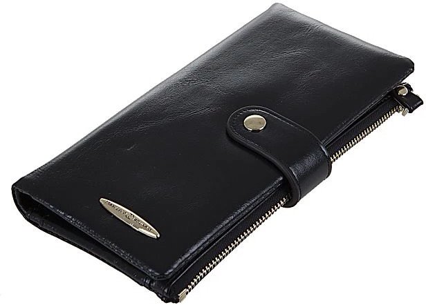 | Информация | ? Стильное портмоне в стиле "ретро" из натуральной черной кожи с винтажным эффектом. ? Металлическая фурнитура золотистого цвета. ? Большой размер, прямоугольной вертикальной формы, закрывается на кнопку, раскрывается книжкой. ? Внутри: три отделения для купюр, восемь карманов для карт, карман-окошко и карман на молнии. ? На задней стороне – карман для монет на молнии с кожаным пуллером. ? Спереди – шильдик с названием бренда. |