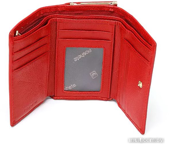 | Информация | Компактный кошелёк от бренда Poshete выполнен из натуральной кожи и несомненно украсит вашу сумочку. Модель красного цвета с золотистой фурнитурой. Раскрывается книжкой, фиксируется кнопкой, внутри два отделения для купюр, карман на молнии и кармашки для карточек. Снаружи отделение на замке поцелуйчике для монет. |