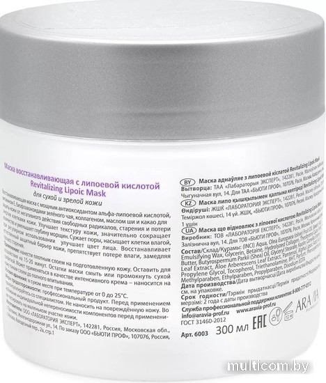 | Информация | Маска для лица кремовая Aravia Professional Revitalizing Lipoic Mask восстанавливающая (300мл) - антиоксидантная маска с альфа-липоевой кислотой, витамином Е, биофлавоноидами зелёного чая, коллагеном, маслом ши и какао для защиты кожи от негативного действия свободных радикалов, старения и потери энергии клетками кожи. Улучшает текстуру кожи, значительно уменьшает морщины. Сужает поры, насыщает клетки влагой, при регулярном использовании улучшает цвет лица. Восстанавливает естественный защитный барьер кожи, препятствует потере влаги, замедляя процесс старения. |