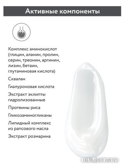 | Активные ингредиенты | пролин; глицин; аргинин; лизин; комплекс аминокислот; гиалуроновая кислота; экстракт эклипты; серин; сквалан; бетаин; протеин риса; экстракт розмарина |