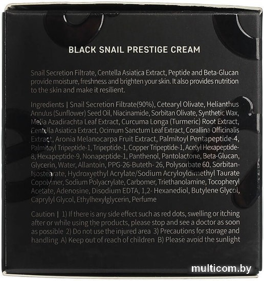 | Состав | Snail Secretion Filtrat, Cetearyl Olivate, Heliantus Annuus (sunflower) Seed Oil, Niacinamide, Sorbitan Olivate, Synthetic Wax, Melia Azadirachta Leaf Extract, Corallina Officinalis Extract, Aronia Melanocarpa Fruit Extract, Palmitoyl Pentapeptide-4, Palmitoyl Tripeptide-1, Tripeptide-1, Copper Tripeptide-1, Acetyl Hexsapeptide-8, Hexsapeptide-9, Nonapeptide-1, Pantenol, Pantolactone, Beta-glucan, Glycerin, Wather, Allantoin, Ppg-26-buteth-26, Polysorbate-60, Sorbatin Isostearate, Hydroxyetil Acrylate/sodium Acryloyldimetil, Taurate Copolymer, Sodium, Polyacrilat, Carbomer, Triethalamine, Tocopheryl Acetate, Adenosine, Disodium Edta, 1,2-hexanediol, Butylene Glycol, Ethylhexylglycerin, Perfume |