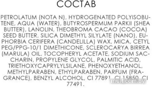 | Состав | Вода, Ланолин, Слюда, Пропиленгликоль, Какао Масло, Феноксиэтанол, Метилпарабен, Этилпарабен, Бензиловый Спирт, Токоферилацетат, Парфюм, Петролатум, Пальмитиновая Кислота, Марулы Масло, Натрия Сахарин, Краситель Cl 15985, Краситель Cl 77891, Краситель Cl 77491, Кремния Диметилсилилат, Полиизобутен Гидролизованный, Триэтоксикаприлилсилан, Воск Канделильский Молочайный, Цетил Пэг-ппг-10-1 Диметикон, Масло Ши. |