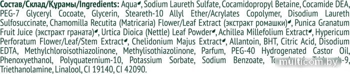 | Состав | Aqua*; Sodium Laureth Sulfate; Cocamidopropyl Betaine; Cocamide DEA; PEG-7 Glyceryl Coconate; Glycerin; Steareth-10 Allyl Ether/Acrylates Copolymer; Disodium Laureth Sulfosuccinate; Chamomilla Recutita (Matricaria) Flower/Leaf Extract* (экстракт ромашки); Punica Granatum Fruit Juice (сок граната); Urtica Dioica (Nettle) Leaf Powder*; Achillea Millefolium Extract*; Hypericum Perforatum Flower/Leaf/Stem Extract*; Chelidonium Majus Extract*; Allantoin; BHT; Citric Acid; Disodium EDTA; Parfum; PEG-40 Hydrogenated Castor Oil; Phenoxyethanol; Polyquaternium-10; Potassium Sorbate; Sodium Benzoate; Tocopherol; Trideceth-9; Triethanolamine; Linalool; CI 19140; CI 42090. |