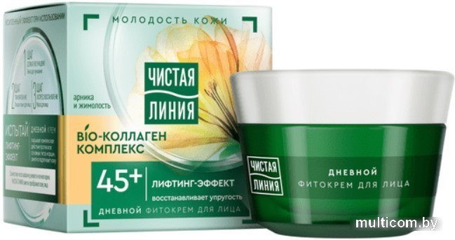 | Информация | Уверены ли вы, что ваша кожа получает все необходимые питательные вещества? Ведь в зрелом возрасте именно питание и увлажнение кожи — главные помощники в борьбе за молодость и красоту. С учетом особых потребностей зрелой кожи эксперты Чистой линии разработали специальную линейку средств от 45 лет. Активные натуральные компоненты, входящие в состав средств, эффективно борются с морщинами, выравнивают цвет лица и наполняют кожу энергией и сиянием. В состав кремов линейки входят активные натуральные компоненты, созданные самой природой: арника, жимолость и комплекс фито-протеинов. Кремы Чистая Линия обогащены комплексом Фитоколлаген из ростков и семян пшеницы. Уже с первого применения проникая в кожу, комплекс Фитоколлаген наполняет и разглаживает ее. Уже через 16 дней восстанавливает контуры лица. Дневной фито-крем c арникой и жимолостью от 45 лет эффективно увлажняет и питает кожу, разглаживает морщины. Активные натуральные компоненты комплекса Фитоколлаген с ростками и семенами пшеницы, проникая в кожу, разглаживают ее, наполняют энергией и придают сияние.Результат: мгновенно разглаживает мелкие морщинки и подтягивает кожу, за 16 дней выраженный лифтинг-эффект, заметно меньше морщин, кожа гладкая и упругая. |